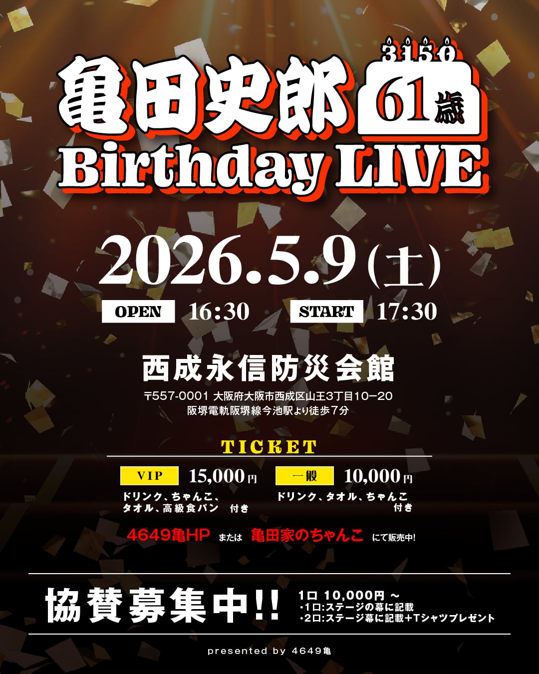 5/9(土)に行われる「亀田史郎 61歳 Birthday LIVE」のご協賛を募集します。